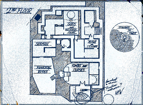 To reach this location from Gods and Religious Items, solve the red door puzzle there. This location consists of three connected rooms, colored red, blue and green. On entering the first (red) room reached from Gods and Religious Items, immediately turn left and check out the "Ancient Astrology" book and photos in Merrick's backpack. Across from the backpack is the music box in which you can access a pot or lid by turning its crank. This will work only if you've left Song B2 (Anansi the Spider) loaded on the jukebox in the clock Tower. To the left of the music box is a wax snake that may be hiding an Ixupi. Next to the snake is a Maori chest which discloses a pot or lid when opened.
