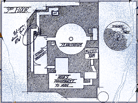 These rooms are accessible from a doorway in Man's Inhumanity to Man. At the end of the first L-shaped room is the Phoenician Puzzle controlling access to the next room through a panel in the wall. After the puzzle is solved, back out and the lower panel with question marks is now ajar. Go through this door into the next puzzle room. Click a few times only on the right-hand image Still life with skull, candle and book by Paul Cézanne, until a human-shaped depression can be seen in the checkerboard wall ahead. Click forward toward this shape as far as possible, then turn right to access the Pinball Machine puzzle. After that puzzle is solved, proceed through the now-open doorway in the checkerboard wall and access a pot or lid at the far end of the bridge.