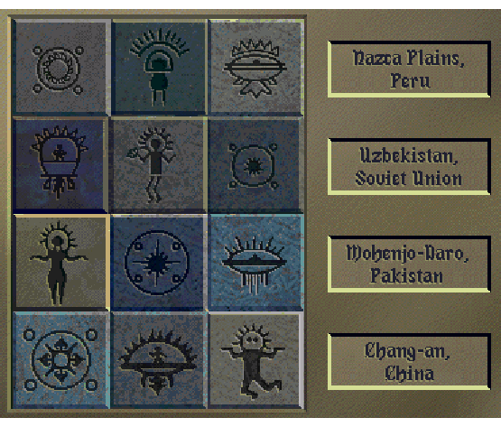 The planetarium is up a staircase from the hallway connecting Myths and Legends and the bathroom. After entering the planetarium, bear to the left of the orrery and zoom in on a vertical blue ring on the wall. Click on its center to bring up an extraterrestrial pictograph puzzle, in which any two symbols can be swapped. Use the information from the "In Search of the Unexplained" book in the library to arrange the appropriate symbols: