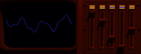 Zoom out and open up the Brain Dumpster machine between the two coffins. Insert Dr. Barton's (red) programming cylinder and the security key into the receptacles (some incorrect screen cursors and artifacts may be experienced at this point). In order to interrupt the transfer, you need to set the sliding frequency controls on the right side of the console to make the yellow line match the blue line (these controls may be slow to drag). The correct configuration is 4 3 1 0 2: