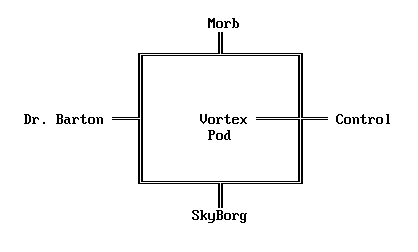 Turn right and pick up Dr. Barton's neural scan programming cylinder from the table. Turn left and zoom in on the right-hand coffin (green screen) to hear Morb's ravings. Zoom out and zoom in on the left-hand coffin to get some instructions from Dr. Barton. If desired, zoom in again on the right and left coffins for more speeches.
