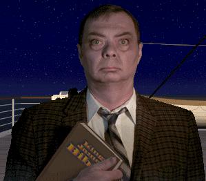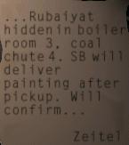 Move O F L2 F R2 F3 R F L O F3 O F3 O F2 into Boiler Room 3. Standing on the catwalk is Vlad Demonic. If you pass him and move R F L2 to coal chute 4, you can get the Rubaiyat from the coal chute control panel (and even befriend a fireman by calling him a landlubber), but Vlad will kill you when you try to go back up to the catwalk with the book. Instead, ask Vlad about his troubles and offer to get him a package from Sasha Barbicon. Move L2 F O F3 O F3 O F R2 F L2 F3 L F R O F3 O F3 R F3 L O F2 to an area where you can jump to the Grand Staircase on A Deck. Move F2 R F2 O F4 L F R O to the cabin of Sasha Barbicon (A-14).