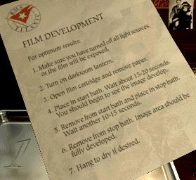 Move F3 and zoom in on the darkroom table. At center left, pick up the film development instructions, thoughtfully provided by the White Star Line on their official paper: