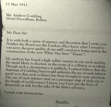 Move L3 F O F L2 3(F R) F L O F O F R3 F4 R O F R2 7(F R) to the B-deck Second-Class stairs via the boat deck. Tell the crewman you'll take your chances, then move 4(F R) and click on Shailagh Hacker to get Conkling's letter from her: