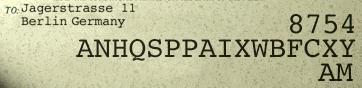 Jump to the Grand Staircase on C Deck and move R F R O F6 L O F2 L into your cabin (C-73). You may randomly run into other passengers as you move about. Open your steamer trunk with the key in your bag and open the drawer at lower left. On the decoding machine, attach the green and red leads to the dry cell battery and turn on the device using the switch at left. Rotate the number wheels at top center to set the 8754 code from Zeitel's telegram inside the black frame. Click on the bag and highlight the telegram inside the pocket. Click OK, then click on the telegram at lower right. Using the alphabetic keypad on the decoder, enter the encoded text string A N H Q S P P A I X W B F C X Y A M, then press the DECODE button to obtain the secret message: