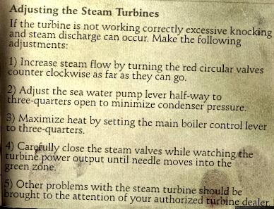 As it happens, the access to G Deck is close at hand. Move L 3(F L) 6(F R) F O F R2 F3 L F2 O F3 down the stairs to the Turbine Room and through it into the Control Room. When you try and open the door into the Engine Room, a crewman starts whining to you about his boilers. Offer to solve his problem, to help him. Back out from the steam turbine control panel (unless you know what to do), and ask the crewman for some advice. He'll give you the instruction manual: