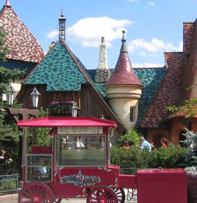 Unlike Disneyland, DLP popcorn cart figures are of only three or four basic styles, not always as obviously themed to the land in which they are found. There is more repetition in the figure design, with similar figures used in multiple locations. For example, we may find turn-of-the-century figures in places as diverse as Discoveryland, the Central Plaza and Fantasyland, or Arabic figures in Adventureland and Fantasyland. This theming, while not exactly inappropriate, seems more subtle than what is found in Disneyland.