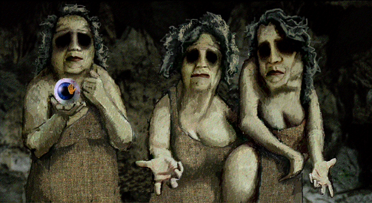 Note that the leftmost old woman pauses momentarily while tossing the eyeball