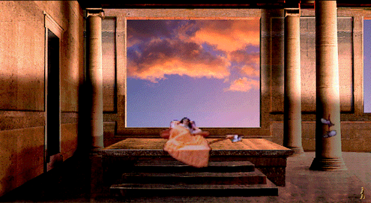 Control of your third-person videotaped explorer is through a few icons selected at the bottom of the screen. The Walk cursor is used for any movement verbs for the Hero's whole body, such as climb, jump, move, swim, enter or exit. Similarly, the Hand cursor is for any direct interaction with the environment, such as give, take, put, use, wear, pick up, touch, drink, eat, open, throw or push. The Eye cursor can be used to get a text description of an object or area. A scrolling inventory bar is also shown under the game's viewport; certain objects can be combined by clicking them on the Hero or on the ground. Any invalid use of inventory at the moment is indicated by a brief verbal admonishment. You can display your current score using the [? Help] button in the lower menu bar. Other details of the user interface, including accessing background information about locations and characters, are described in the help screens.