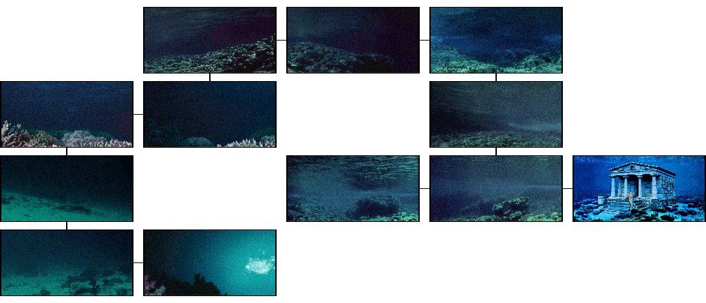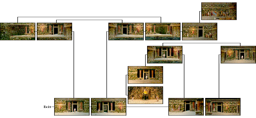 There are over 120 locations to visit in this game, each presented on a photographic background. About 2/3 of them are necessary for a minimal winning path, and about 100 to reach the maximum score. The remaining locations are not essential but can provide additional backstory, and are listed here. Compass directions are given below for movement between them, as shown by the Eye cursor or the corresponding edge of the screen. A number following a direction indicates repetitions. The walkthrough below contains both shortest-route and maximum-score paths; other gameplay sequences and exploration can provide additional backstory elements as well as other ways of solving problems. Inventory item descriptions are shown in bold text.