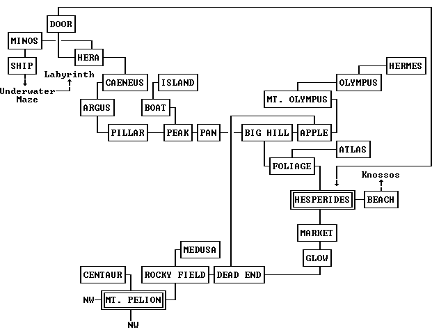 The game provides non-interactive maps of the entire Greek and Cretan world you're exploring, and more detailed versions of these are shown at the bottom of this page with all intermediate nodes identified. As indicated by the in-game selector, maps are organized by quadrants: southwest, northwest, northeast and southeast (Knossos). If you follow this walkthrough, you'll spend approximately equal time in each of the first three quadrants, and a bit less at Knossos.